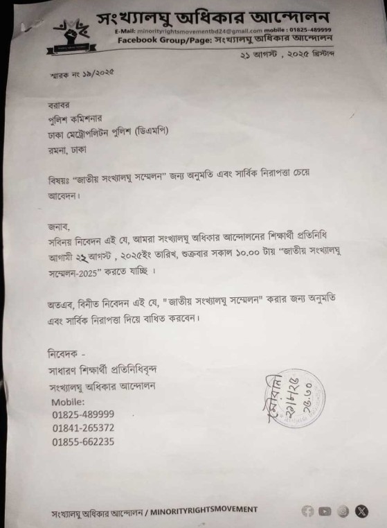 ২২ আগষ্ট শুক্রবার সকাল ১০টায় রাজধানী ঢাকার খামারবাড়ির কৃষিবিদ ইনস্টিটিউশন মিলনায়তনে এই সম্মেলন শুরু হওয়ার কথা ছিল। ‘জাতীয় সংখ্যালঘু সম্মেলন ২০২৫: পাহাড় থেকে সমতল, অস্তিত্ব রক্ষায় অটল’ শিরোনামে সংখ্যালঘু অধিকার আন্দোলন এই আয়োজন করেছিলো। কিন্তু ‘পুলিশি বাধার কারণে’ তা করা সম্ভব হয়নি বলে অভিযোগ করেছেন আয়োজকরা।