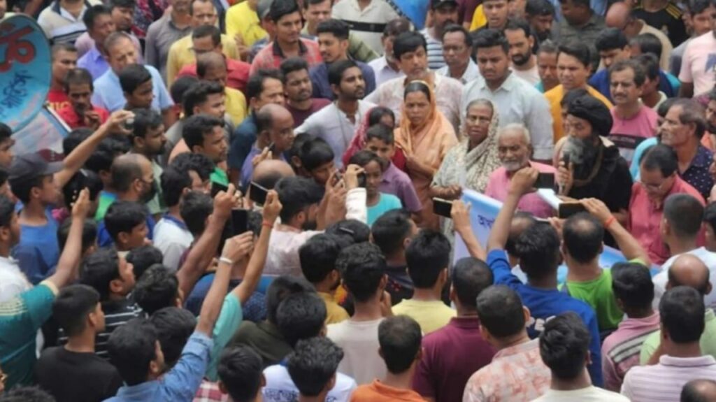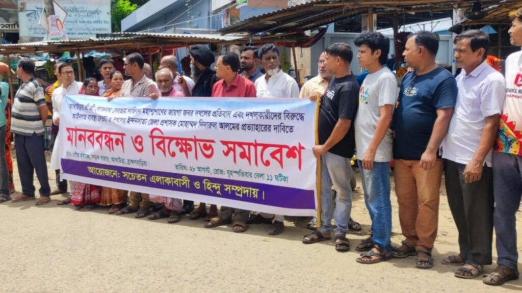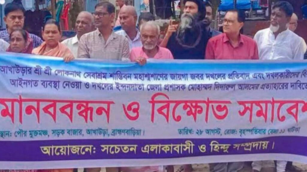 শ্রীশ্রী লোকনাথ সেবাশ্রম শান্তিবন মহাশ্মশানের জমি দখলের প্রতিবাদে মানববন্ধন ও বিক্ষোভ সমাবেশ করেছে স্থানীয় হিন্দু সম্প্রদায়ের লোকজন।
