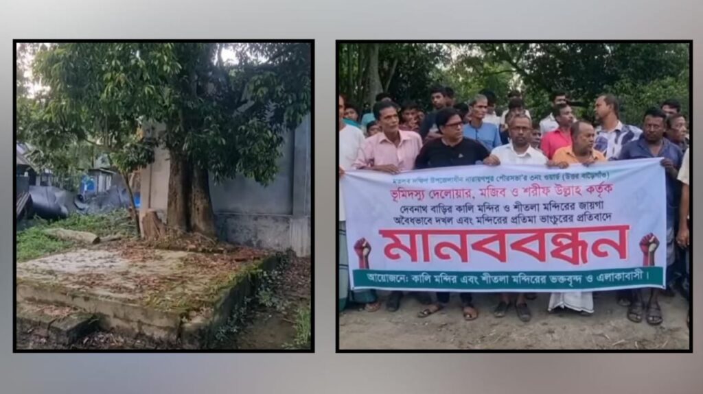 চাঁদপুর জেলা মতলব দক্ষিণ উপজেলার নারায়ণপুর পৌরসভার ৩নং ওয়ার্ড উত্তর বাড়ৈগাঁও গ্রামের দেবনাথ বাড়ির ৩০০ বছরের পুরোন শ্রী শ্রী শীতলা ও কালী মন্দিরের জমি দখল এবং মন্দির কমিটির সদস্যদের হয়রানি ও হুমকির অভিযোগে মানববন্ধন ও প্রতিবাদ বিক্ষোভ কর্মসূচি করেছে স্থানীয় হিন্দু সম্প্রদায়ের লোকজন।