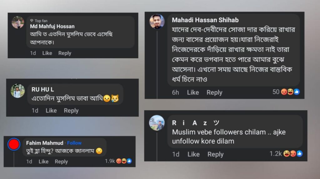 রিয়াজ নামের একজন লিখেছেন, ‘মুসলিম ভেবে ফলোয়ার ছিলাম, আজকে আনফলো করে দিলাম।’