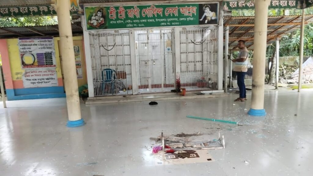 ১১ আগষ্ট সোমবার দিবাগত মধ্যরাতে মন্দিরে ঢুকে ভাঙচুর এবং মলত্যাগ করে মন্দির অপবিত্র করে।।